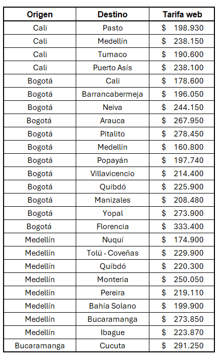 - Aplica en las siguientes rutas: Medellín Bogotá Bogota / Medellín Monteria Medellín / Medellín Pereira Medellín / Medellín Armenia Medellín /Medellín Manizales Medellín / Bogotá Neiva Bogotá / Bogotá Popayán Bogotá / Cali Medellín Cali / Cali Pasto Pasto / Cali Quibdó Cali / Cali Tumaco Cali.